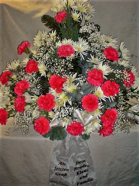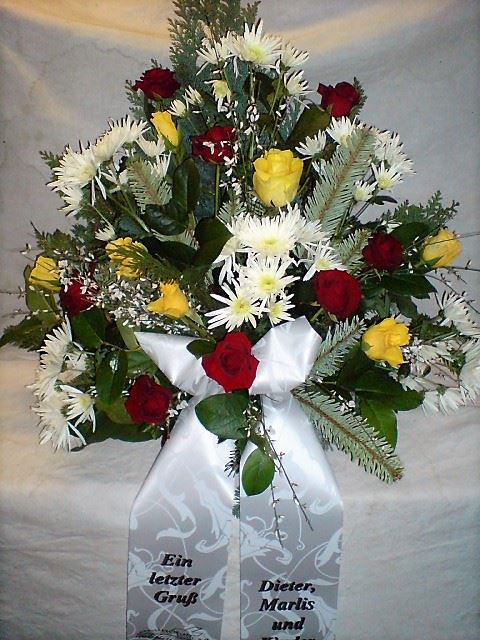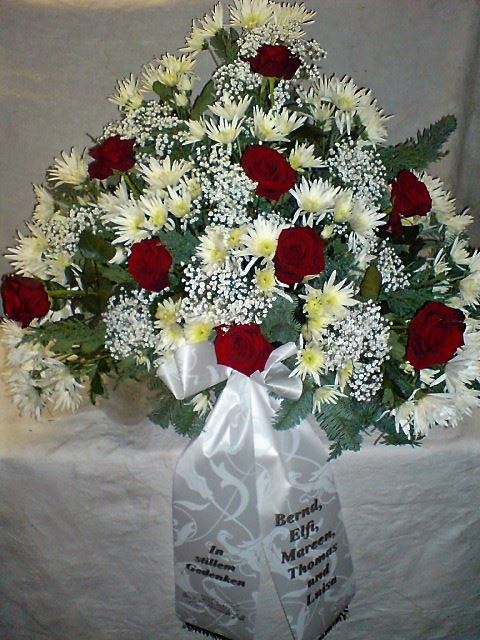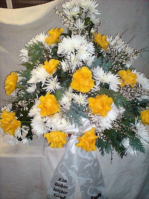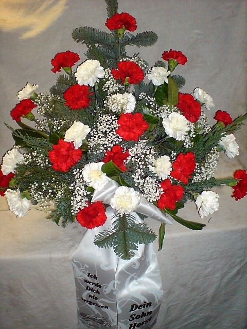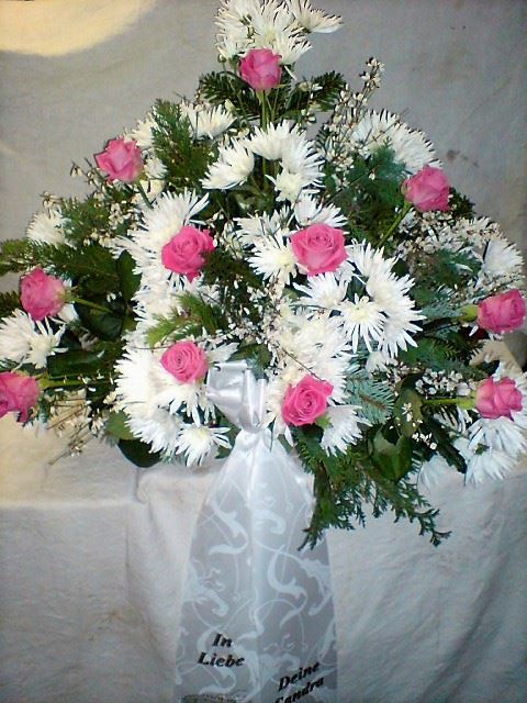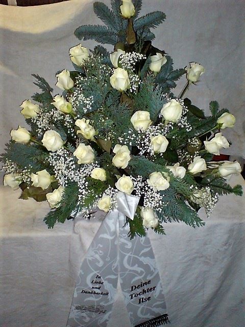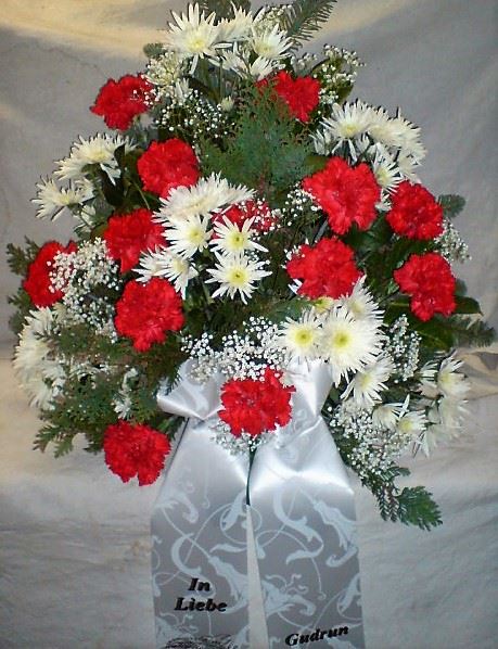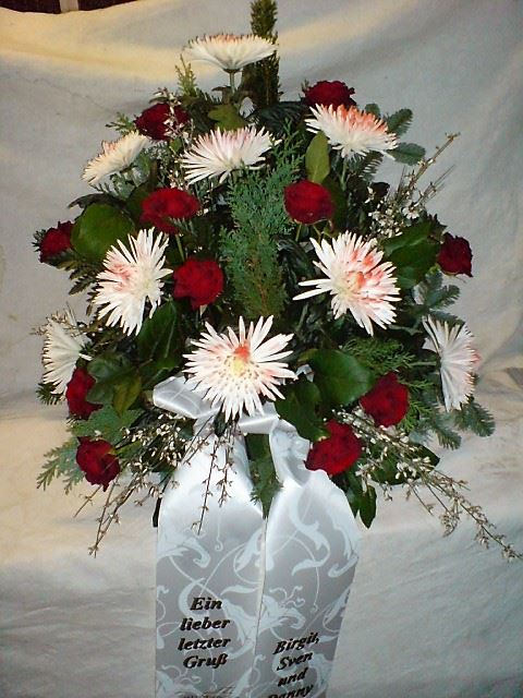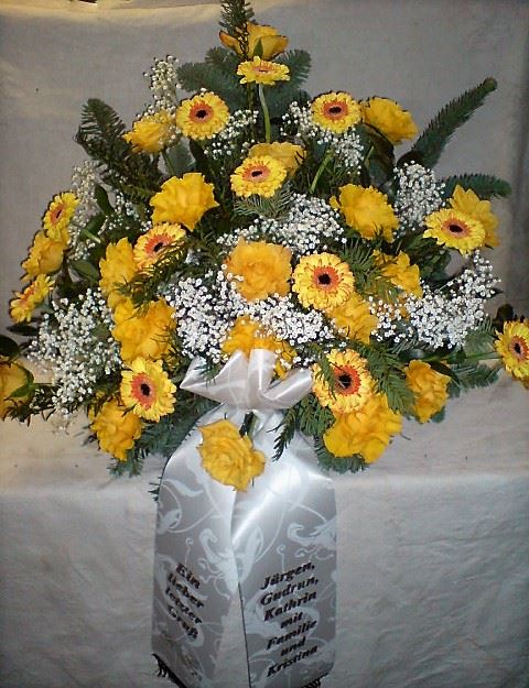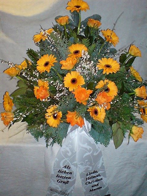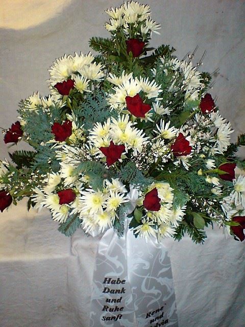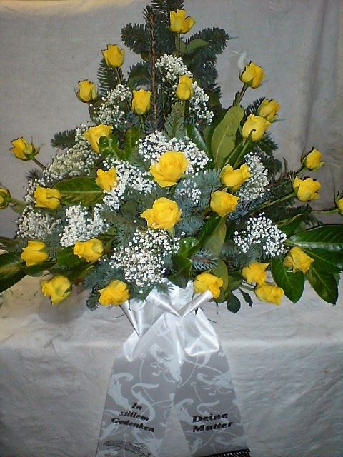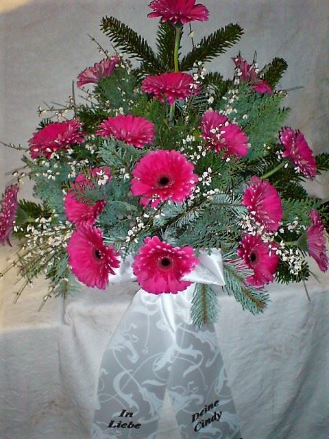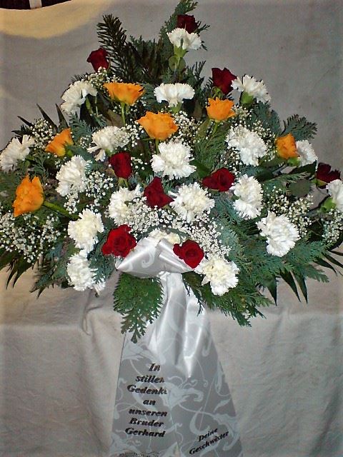 Die Abbildungen tragen eine Bezeichnung, die Ihnen die Kommunikation mit uns vereinfachen soll. Dazu das ausgewählte Bild anklicken. Am linken unteren Bildrand steht die Bildnummer. Also einfach diese Nummer per e-mail oder telefonisch mitteilen. Unsere erfahrenen Floristinnen sind in der Lage, Ihnen genau das Gesteck Ihrer Wahl zu binden.