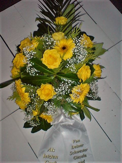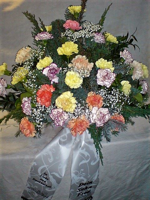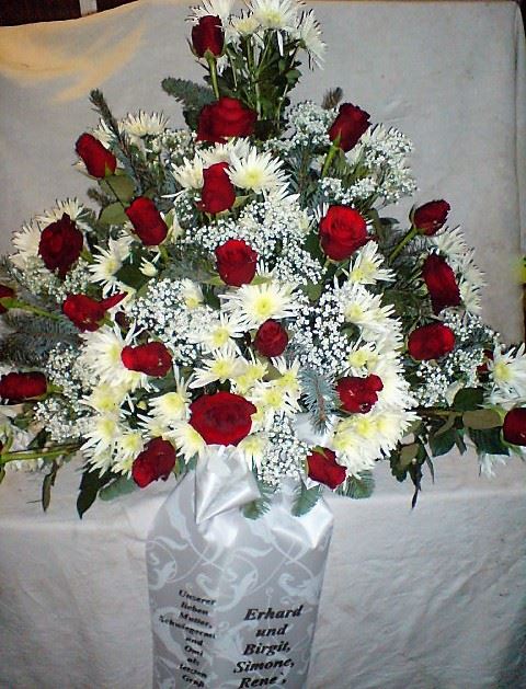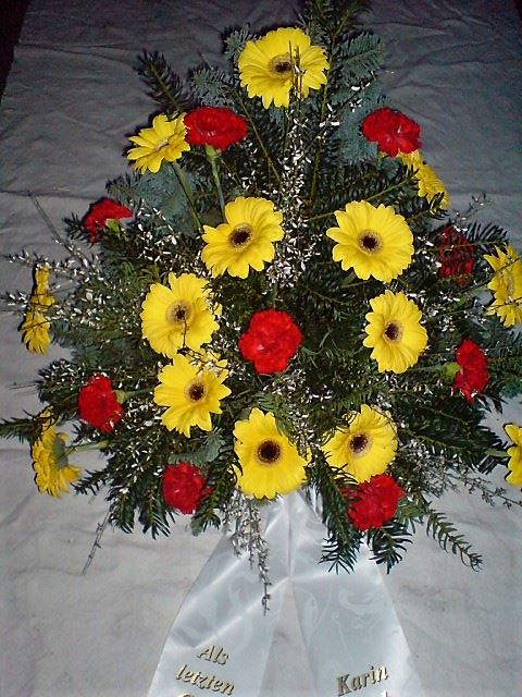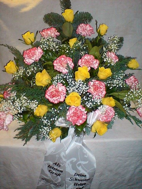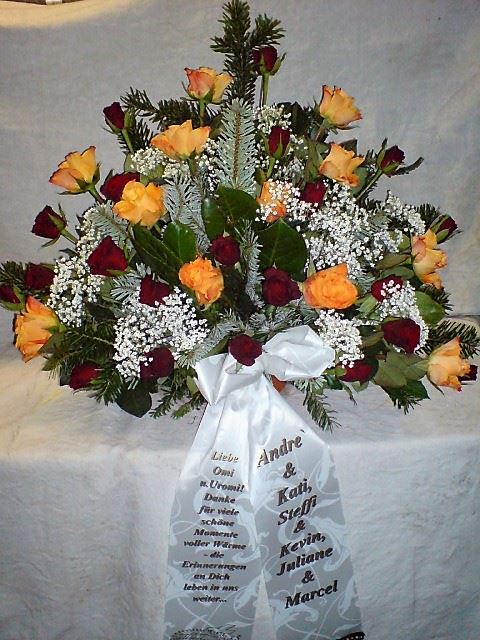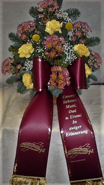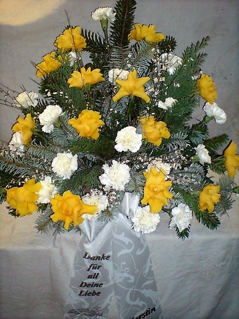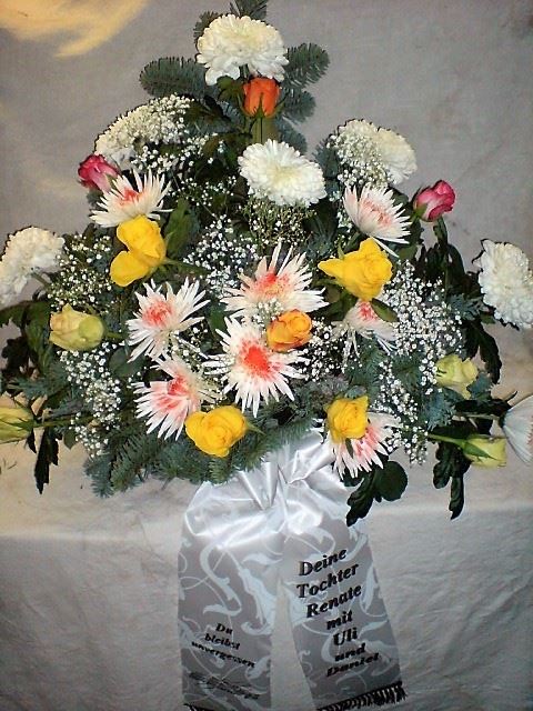 Die Abbildungen tragen eine Bezeichnung, die Ihnen die Kommunikation mit uns vereinfachen soll. Dazu das ausgewählte Bild anklicken. Am linken unteren Bildrand steht die Bildnummer. Also einfach diese Nummer per e-mail oder telefonisch mitteilen. Unsere erfahrenen Floristinnen sind in der Lage, Ihnen genau das Gesteck Ihrer Wahl zu binden.